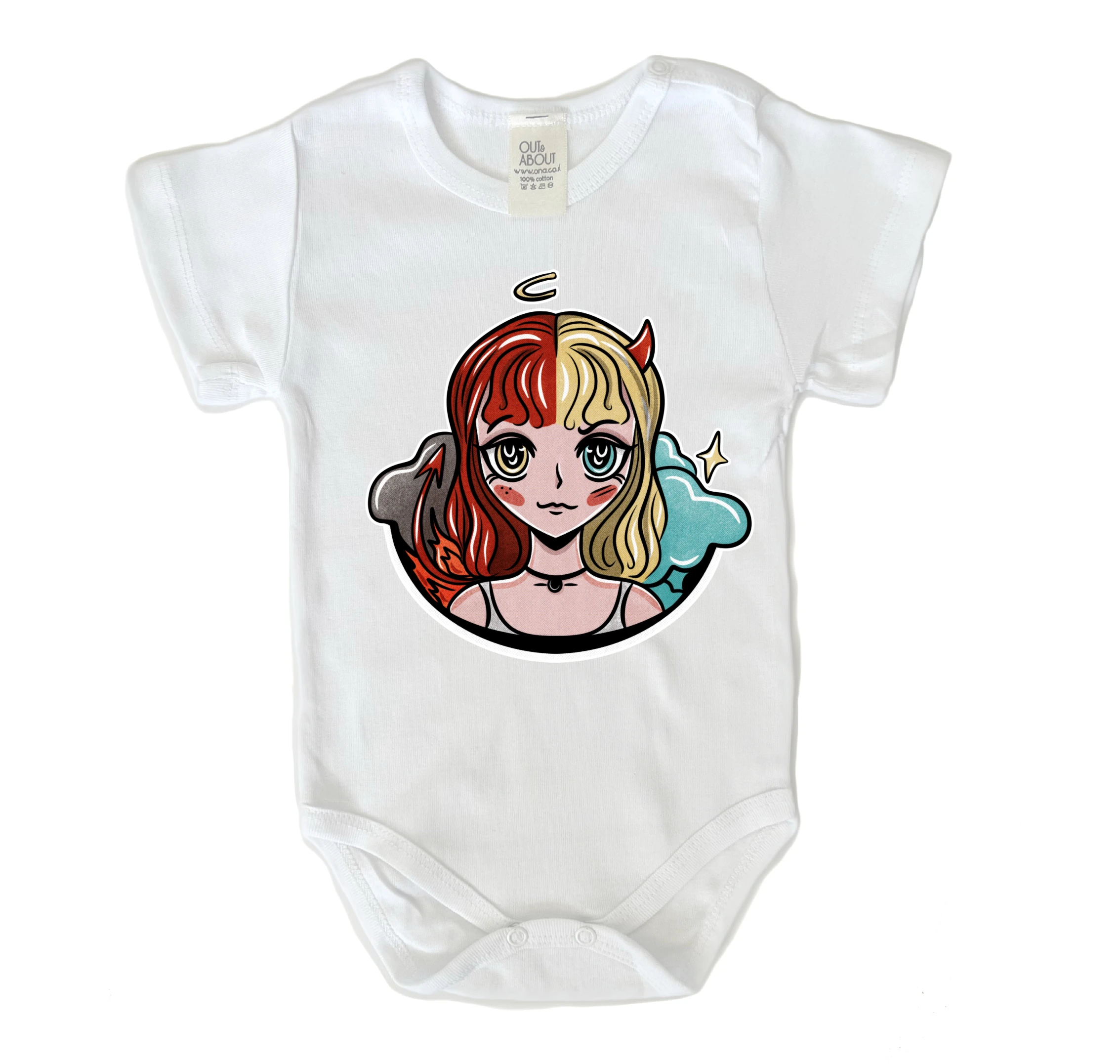 בגד גוף בצבע לבן מיוצר בישראל 100% כותנה רכה ואיכותית הדפס של סטודיו וקטו: ילדה אנימה חצי טובה חצי רעה