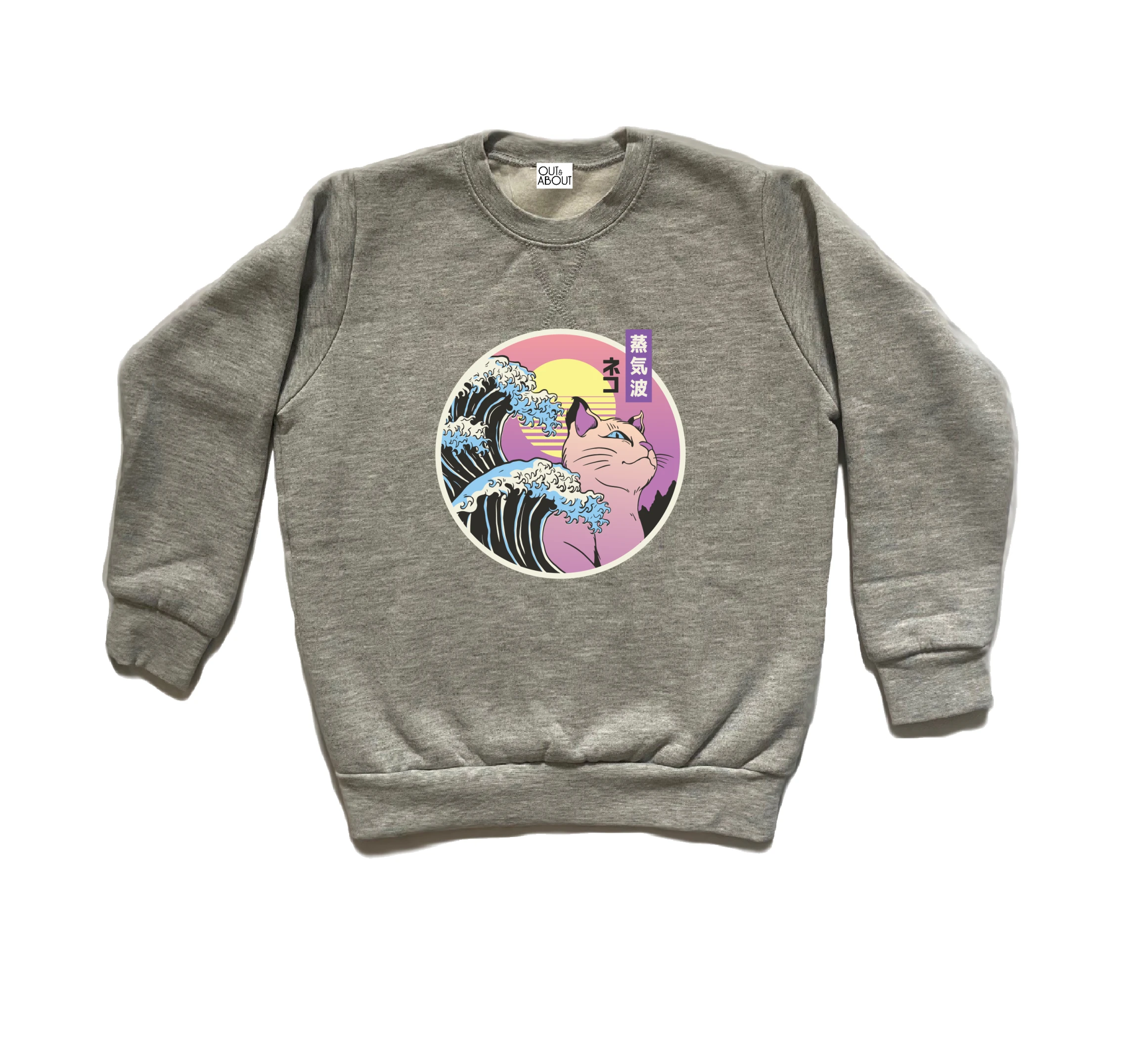 תיאור על ידי בינה מלאכותית: ההדפס 'גל יפני בשקיעה' מציג גל גרפי ואבסטרקטי בגווני כחול, ורוד וסגול על רקע לבן. העיצוב מודפס בסגנון מינימליסטי ומודרני, מתאים במיוחד להדפסה על חולצות ובגדי ריחוף ליצירת מראה צעיר ואופנתי.