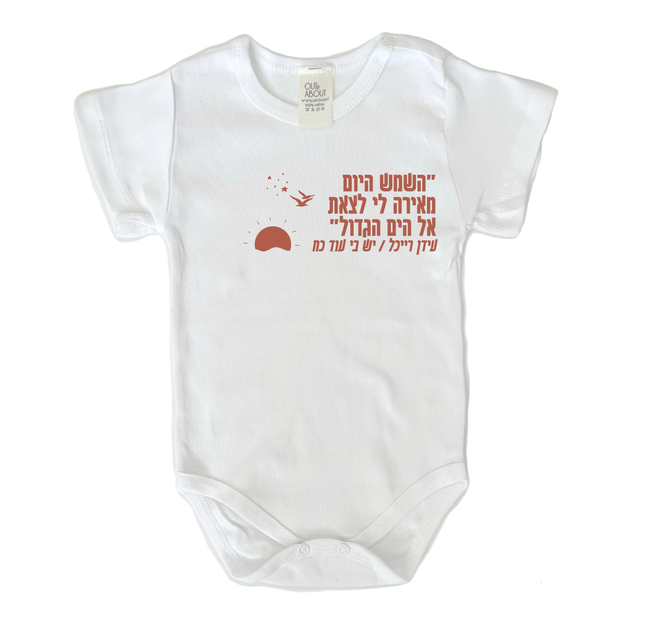 בגד גוף בצבע לבן מיוצר בישראל 100% כותנה רכה ואיכותית ציטוט משיר ישראלי ברישיון תמלוגים של אקום: חור בלבנה רוקפור, בן יצחק ברוך, לולאי אליעזר ורכט דניאל