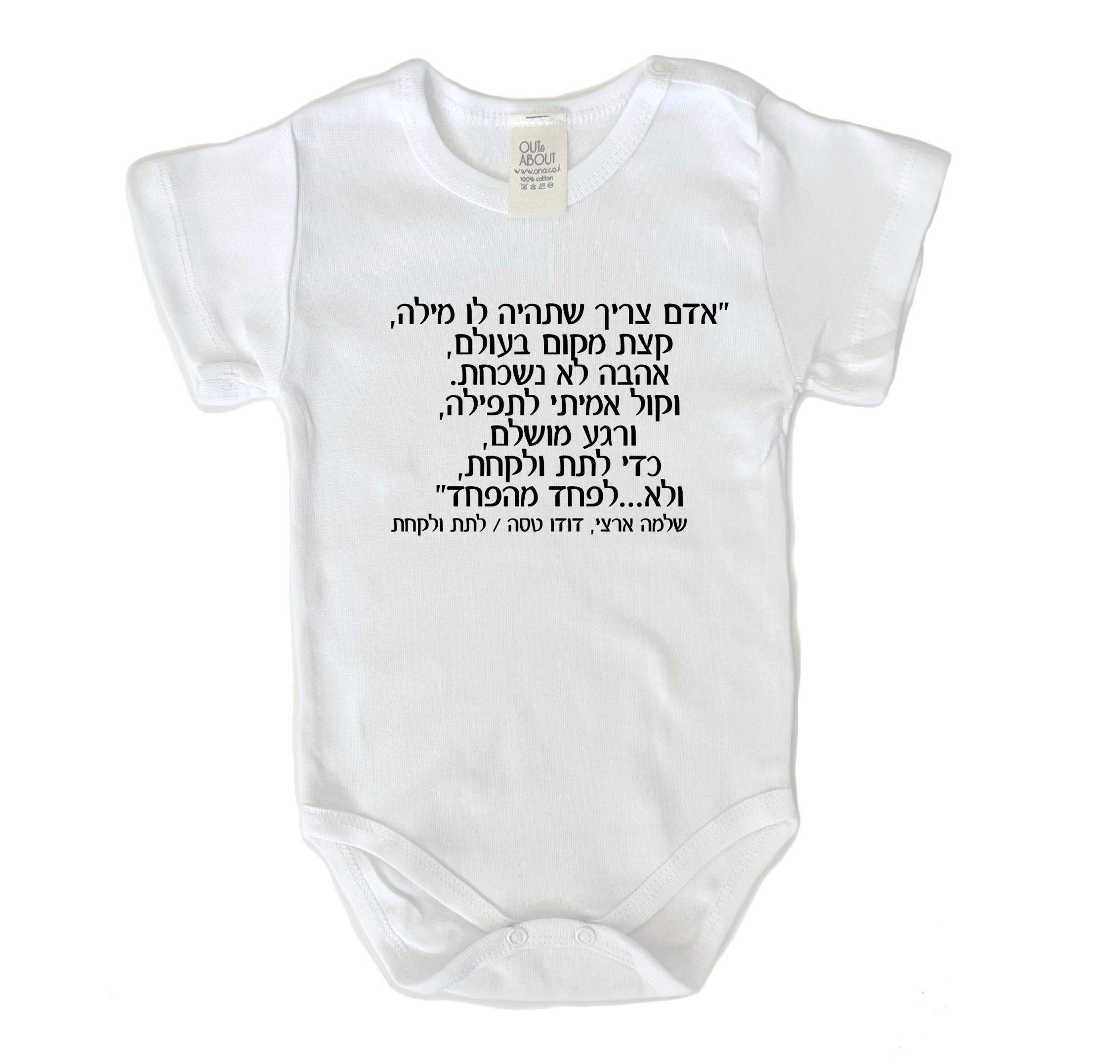 בגד גוף בצבע לבן מיוצר בישראל 100% כותנה רכה ואיכותית ציטוט משיר ישראלי ברישיון תמלוגים של אקום: כל עוד עלי מוהר ויוני רכטר