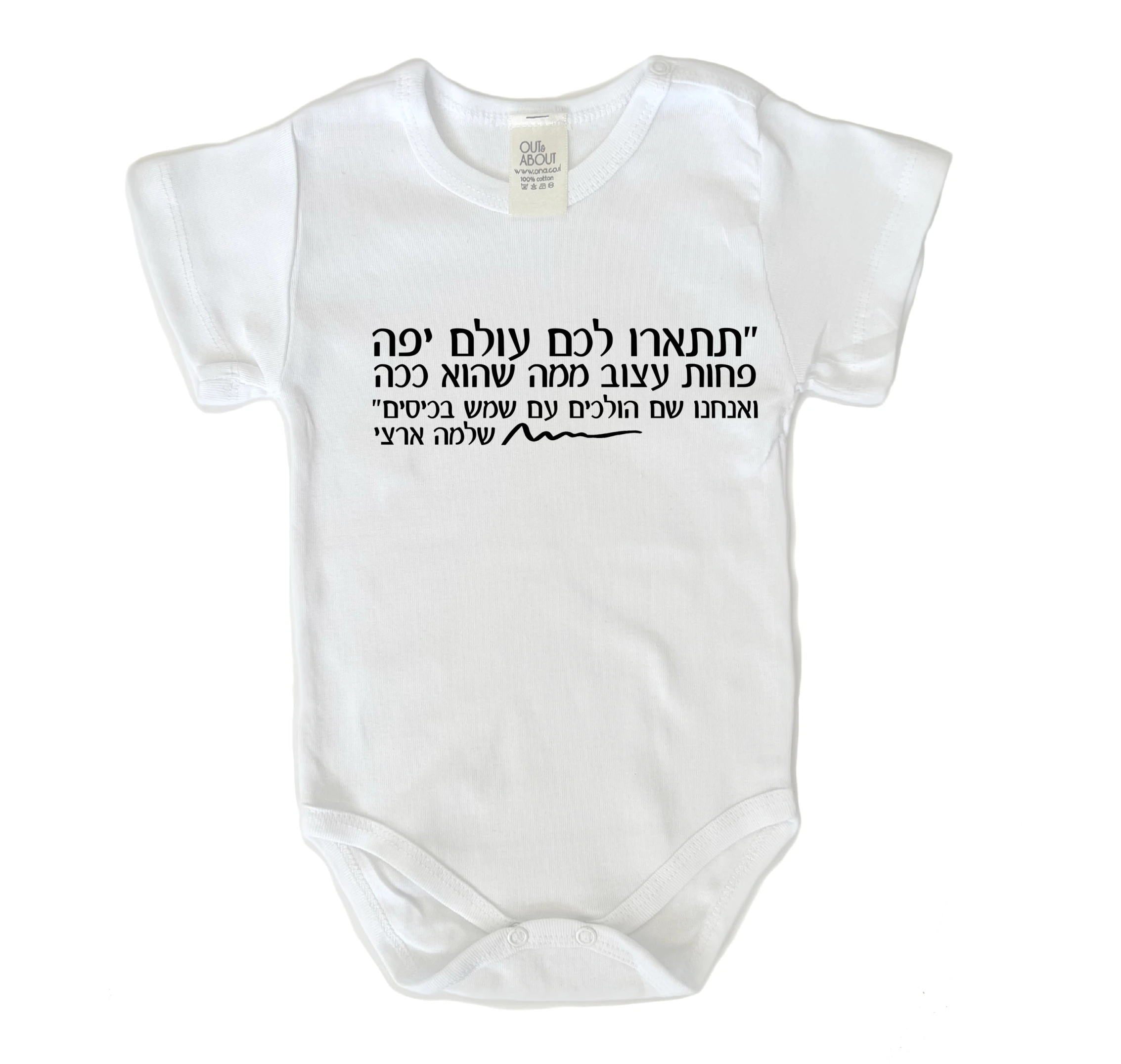 בגד גוף בצבע לבן מיוצר בישראל 100% כותנה רכה ואיכותית ציטוט משיר ישראלי ברישיון תמלוגים של אקום: אז למה לי פוליטיקה עכשיו שלמי ברכה