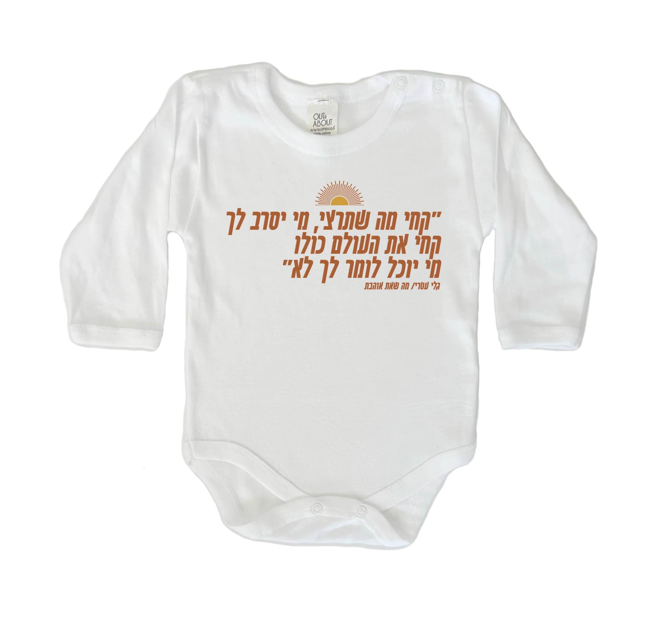 בגד גוף בצבע לבן מיוצר בישראל 100% כותנה רכה ואיכותית ציטוט משיר ישראלי ברישיון תמלוגים של אקום: מלך העולם שלמה ארצי