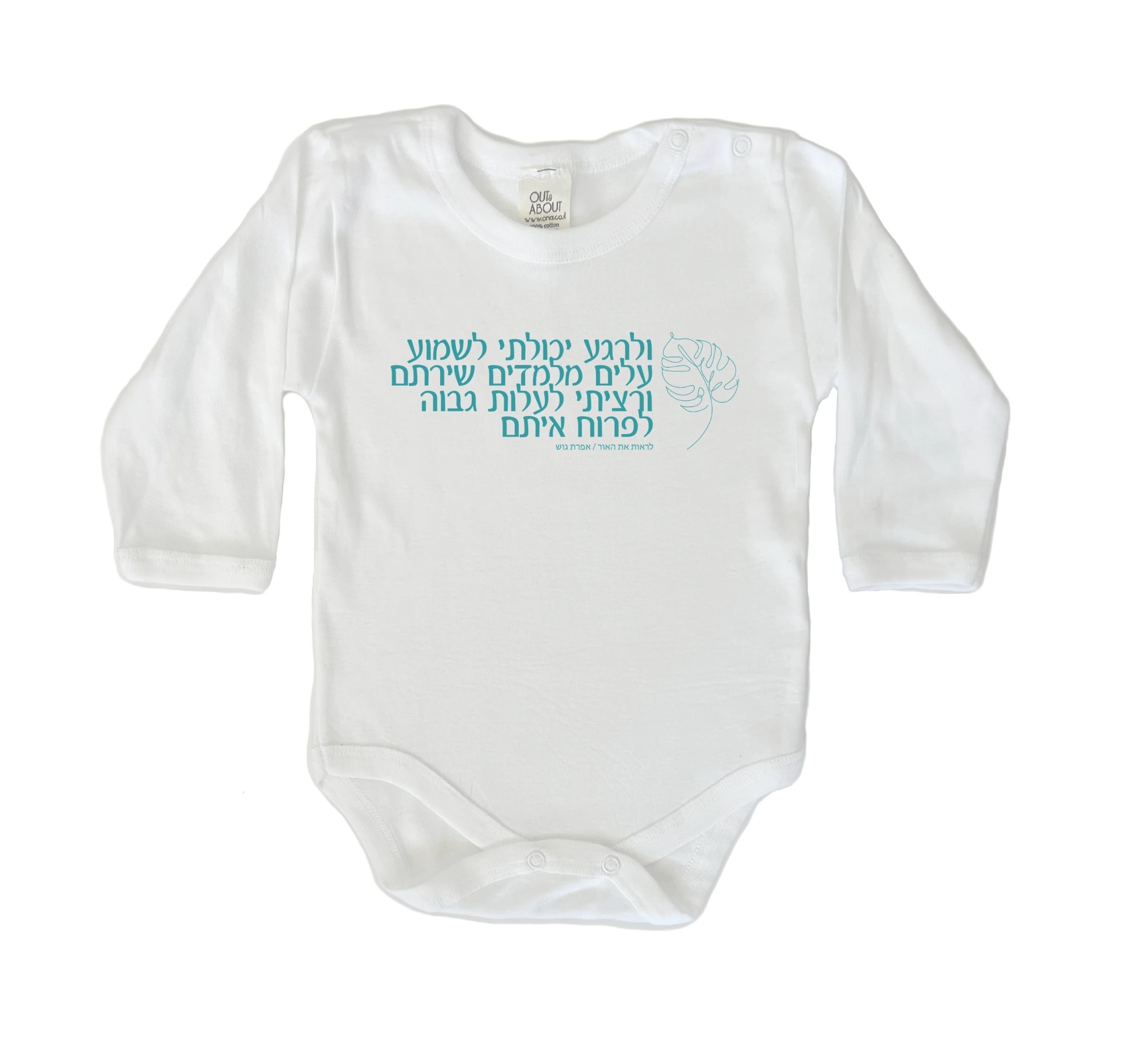 בגד גוף בצבע לבן מיוצר בישראל 100% כותנה רכה ואיכותית ציטוט משיר ישראלי ברישיון תמלוגים של אקום: בחום של תל אביב, מילים עברי לידר לחן הנרי ביצוע שרית חדד