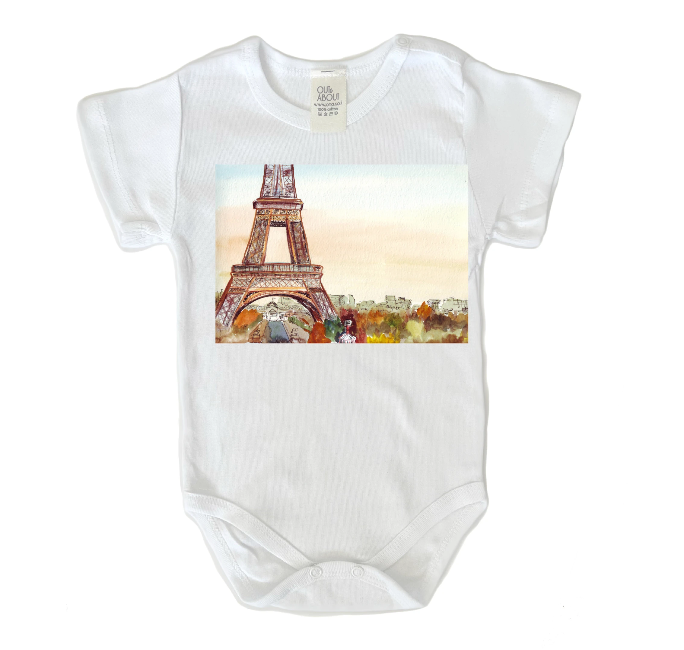 בגד גוף בצבע לבן מיוצר בישראל 100% כותנה רכה ואיכותית ציור של הציירת קסניה רבזין פירות הדר