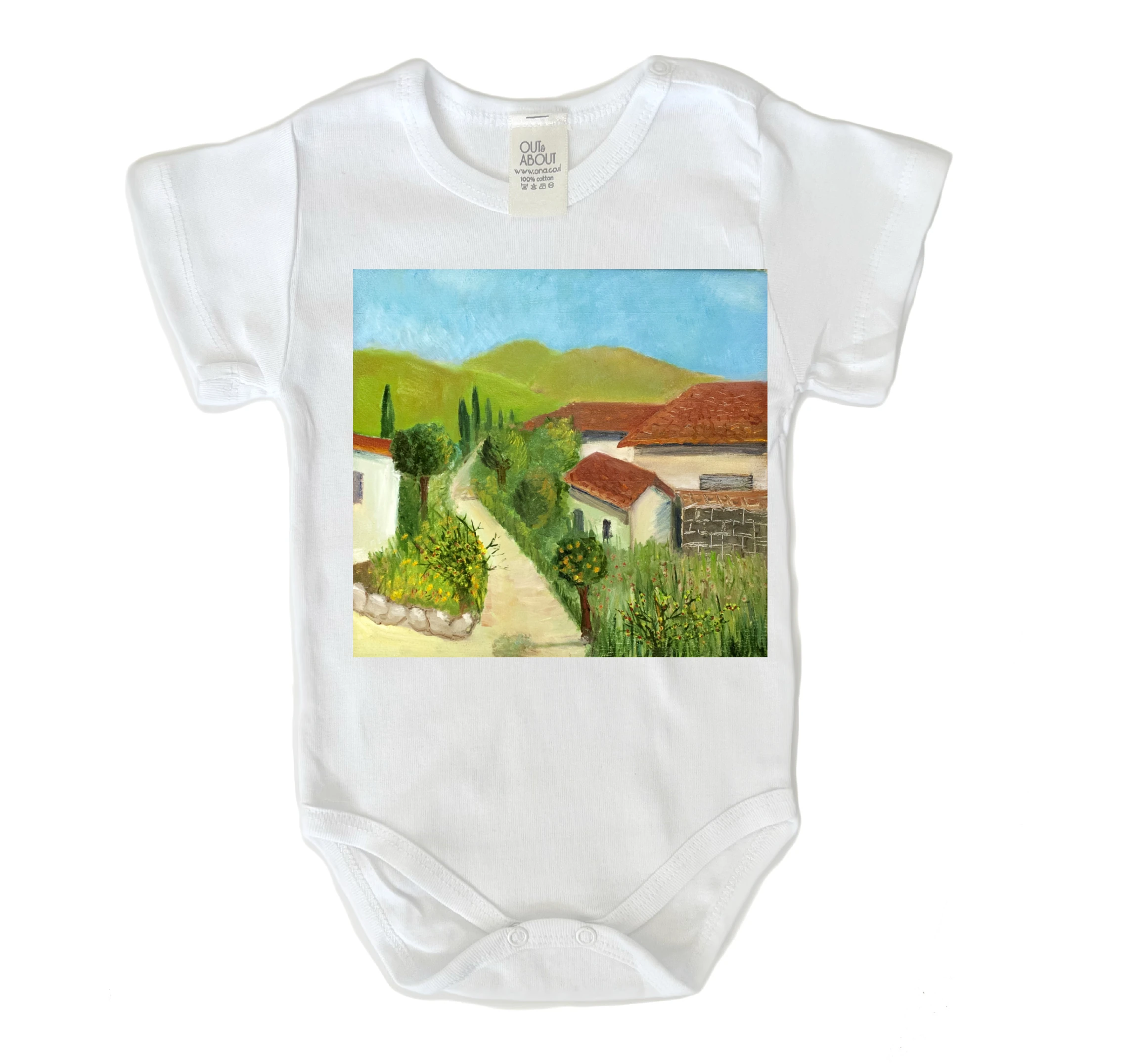 בגד גוף בצבע לבן מיוצר בישראל 100% כותנה רכה ואיכותית ציור של הציירת קסניה רבזין רחוב ישראלי