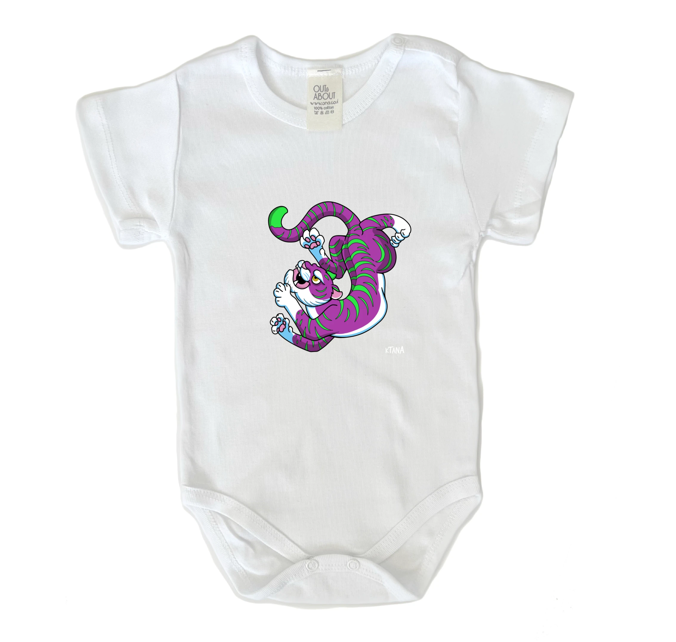 בגד גוף בצבע לבן מיוצר בישראל 100% כותנה רכה ואיכותית נמר טיגריס וורוד של עדי קטנה טאטו