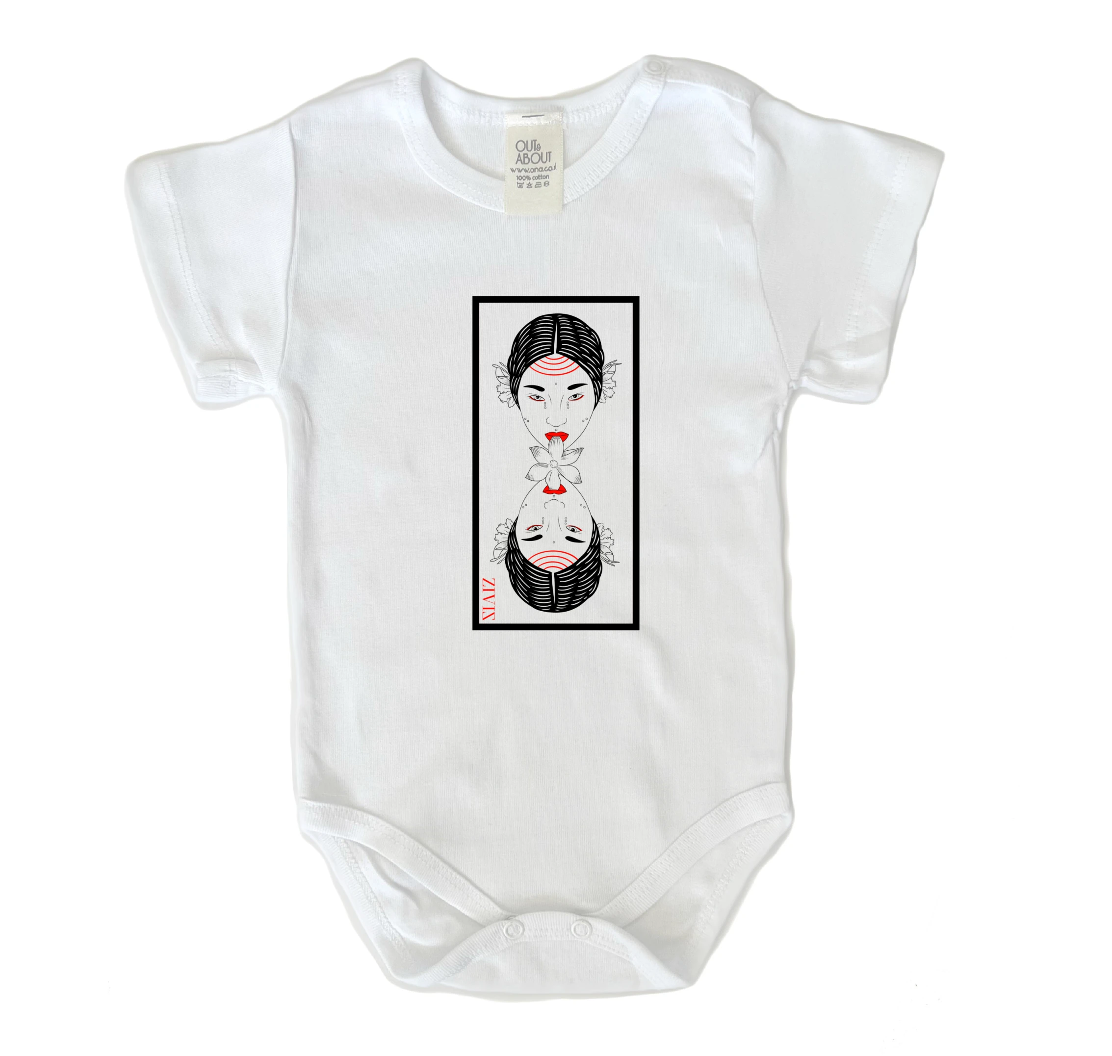 בגד גוף בצבע לבן מיוצר בישראל 100% כותנה רכה ואיכותית אישה יפנית במסגרת של המקעקעת זיו שגיא