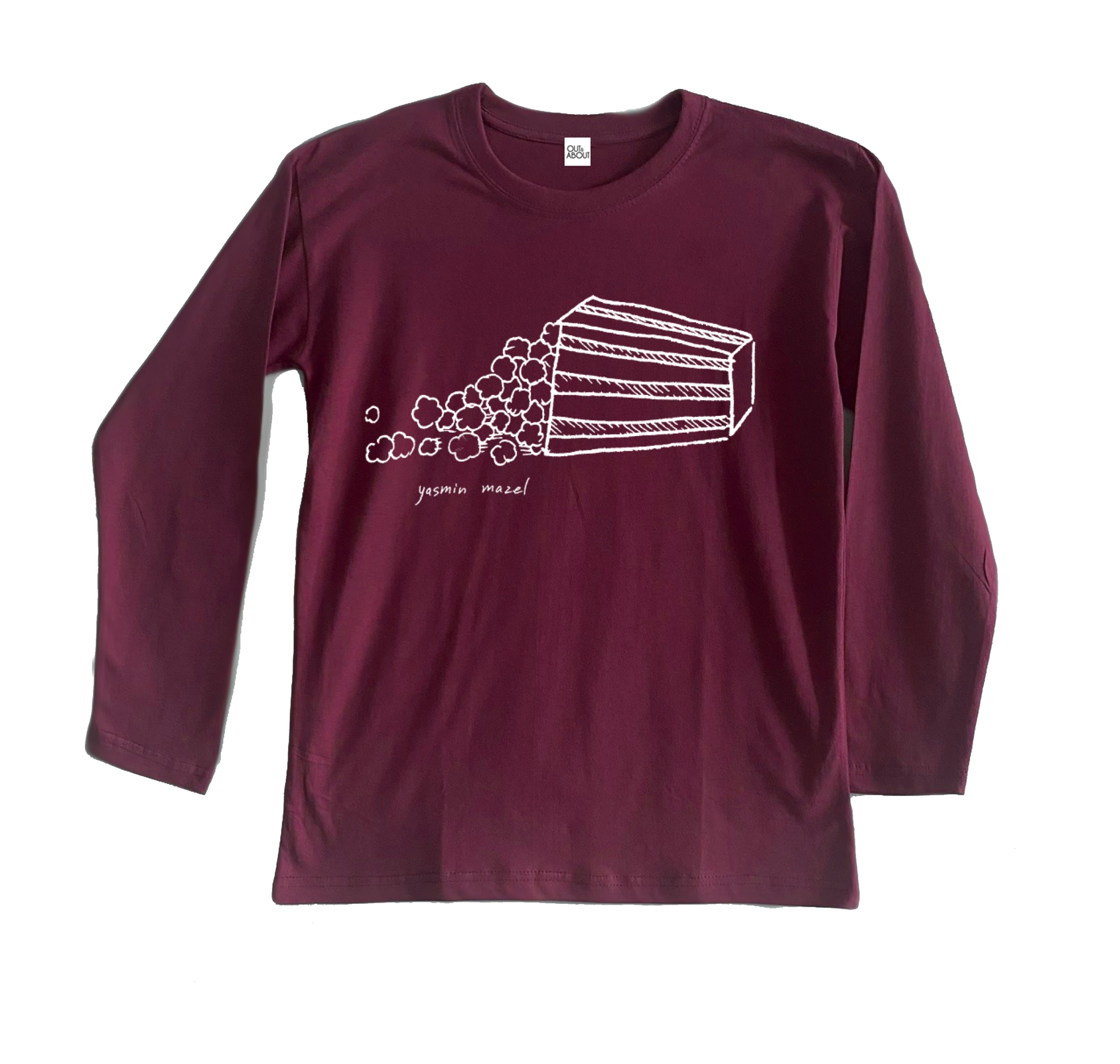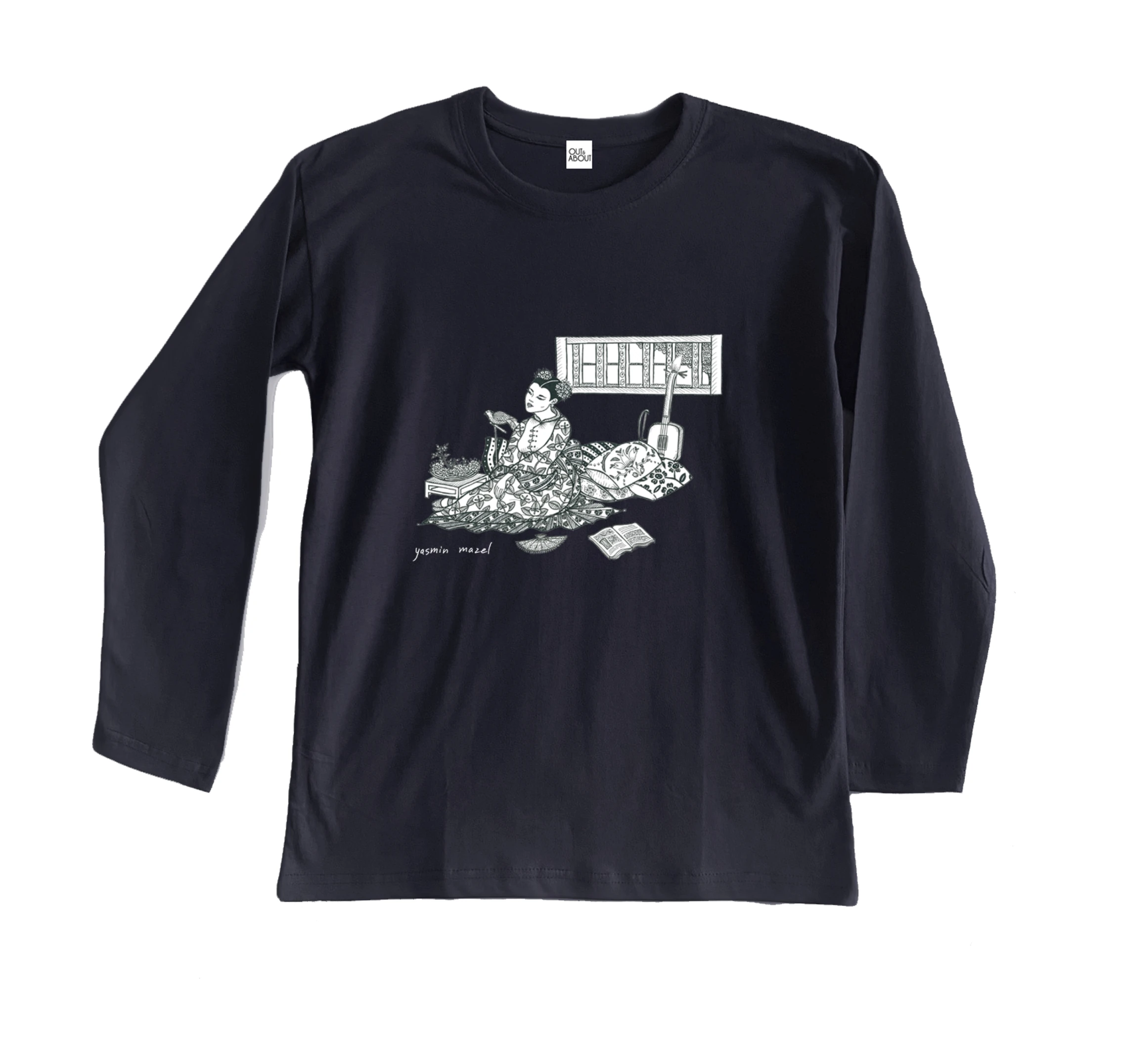 חולצת בייסיק ארוך 100% כותנה איור אישה יפנית עם נזר בוקר של יסמין מזל
