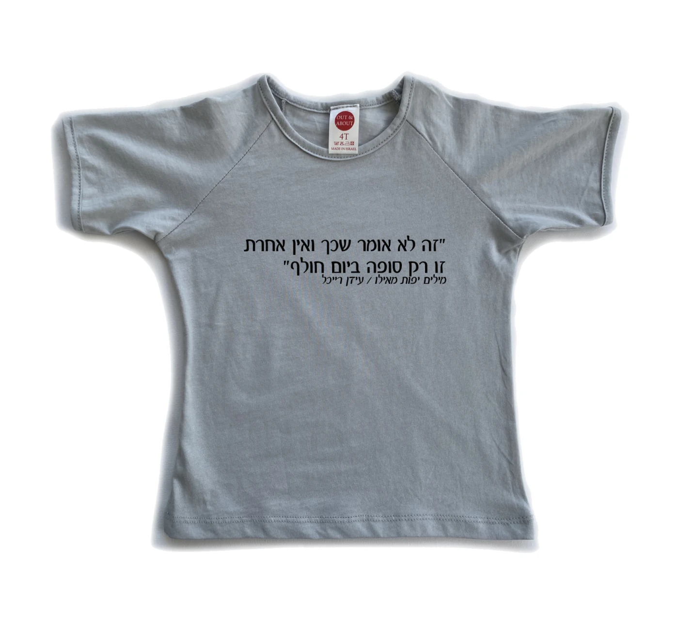 חולצת ילדים 100% כותנה, מיוצר ונתפר בישראל. גזרת רגלן למראה משודרג ציטוט משיר ישראלי ברישיון תמלוגים של אקום: בסוף מתרגלים להכל דודו טסה וטלי כץ