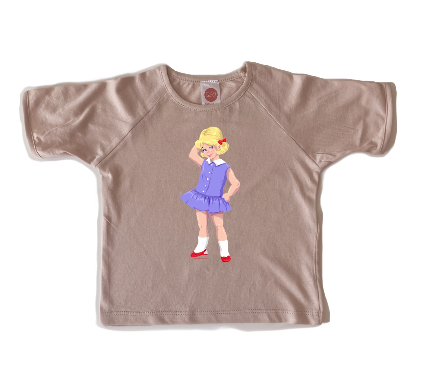 חולצת ילדים 100% כותנה, מיוצר ונתפר בישראל. גזרת רגלן למראה משודרג ילדה בסגנון שנות ה- 50 מחזיקה פרח סביון של אלית אבני שרון