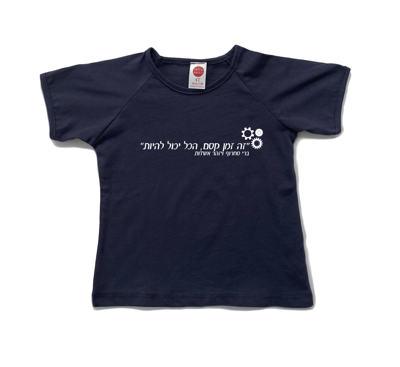 חולצת ילדים 100% כותנה, מיוצר ונתפר בישראל. גזרת רגלן למראה משודרג ציטוט משיר ישראלי ברישיון תמלוגים של אקום: משהו חדש דני רובס ואילאל תמיר