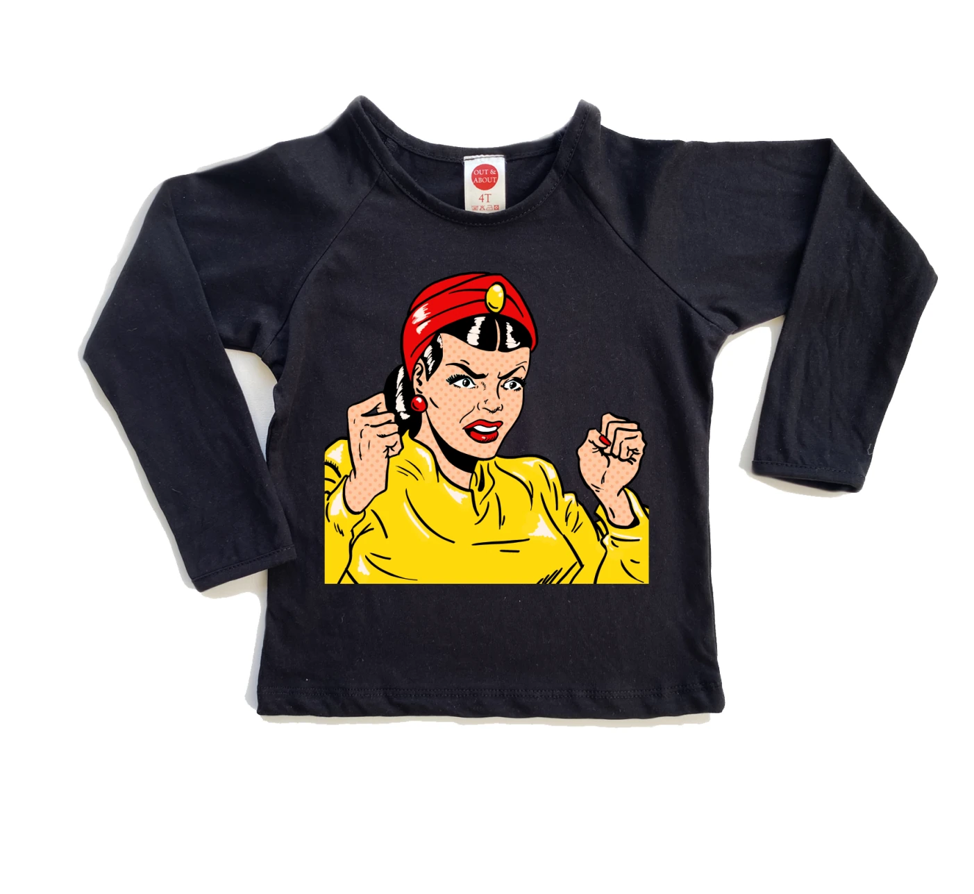 חולצת ילדים 100% כותנה, מיוצר ונתפר בישראל. גזרת רגלן למראה משודרג ציור בסגנון פופ ארט / קומיקס של אלית אבני שרון: אישה בשמלה אדומה