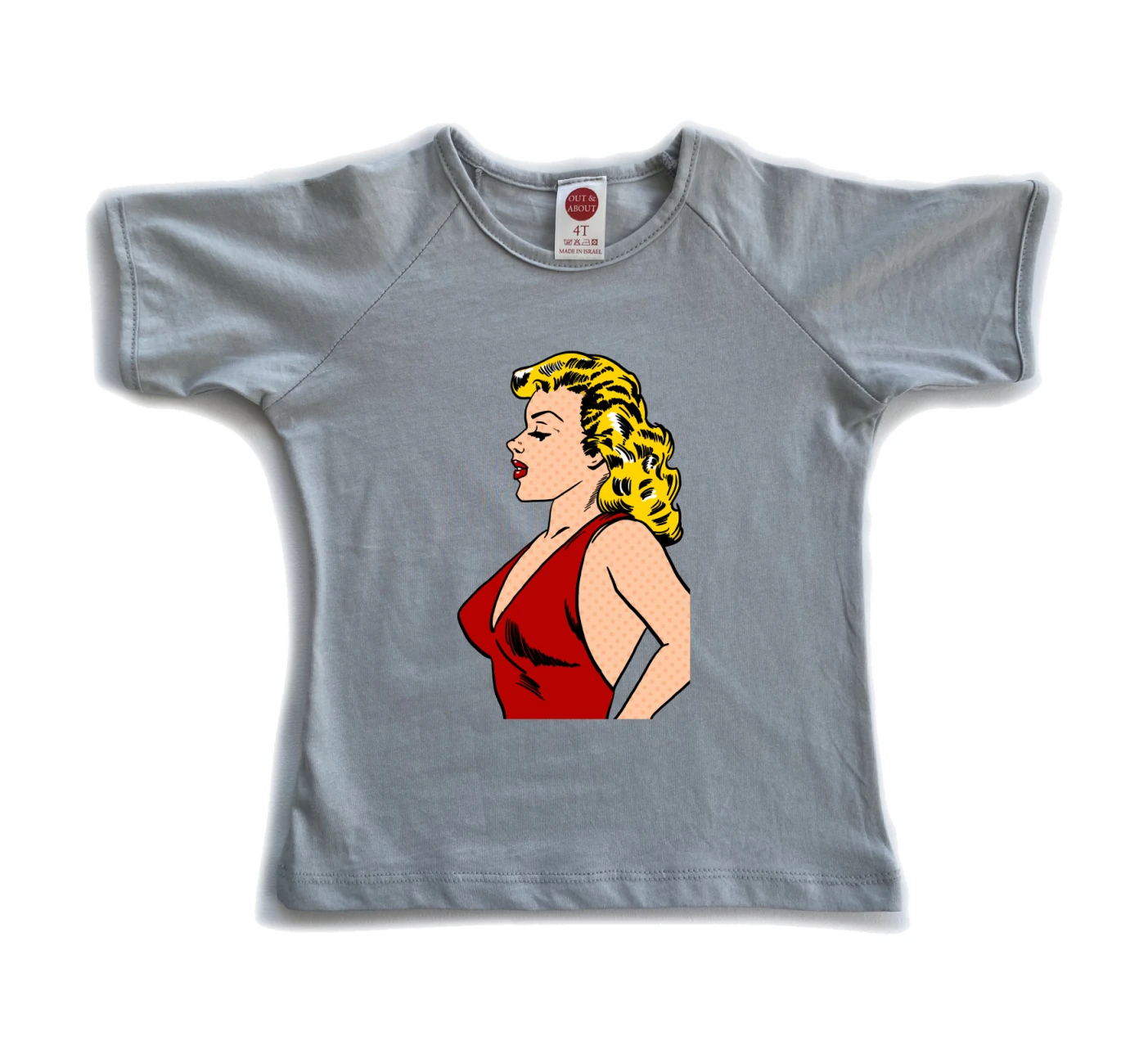 חולצת ילדים 100% כותנה, מיוצר ונתפר בישראל. גזרת רגלן למראה משודרג ציור בסגנון פופ ארט / קומיקס של אלית אבני שרון: אישה בשמלה אדומה בפרופיל