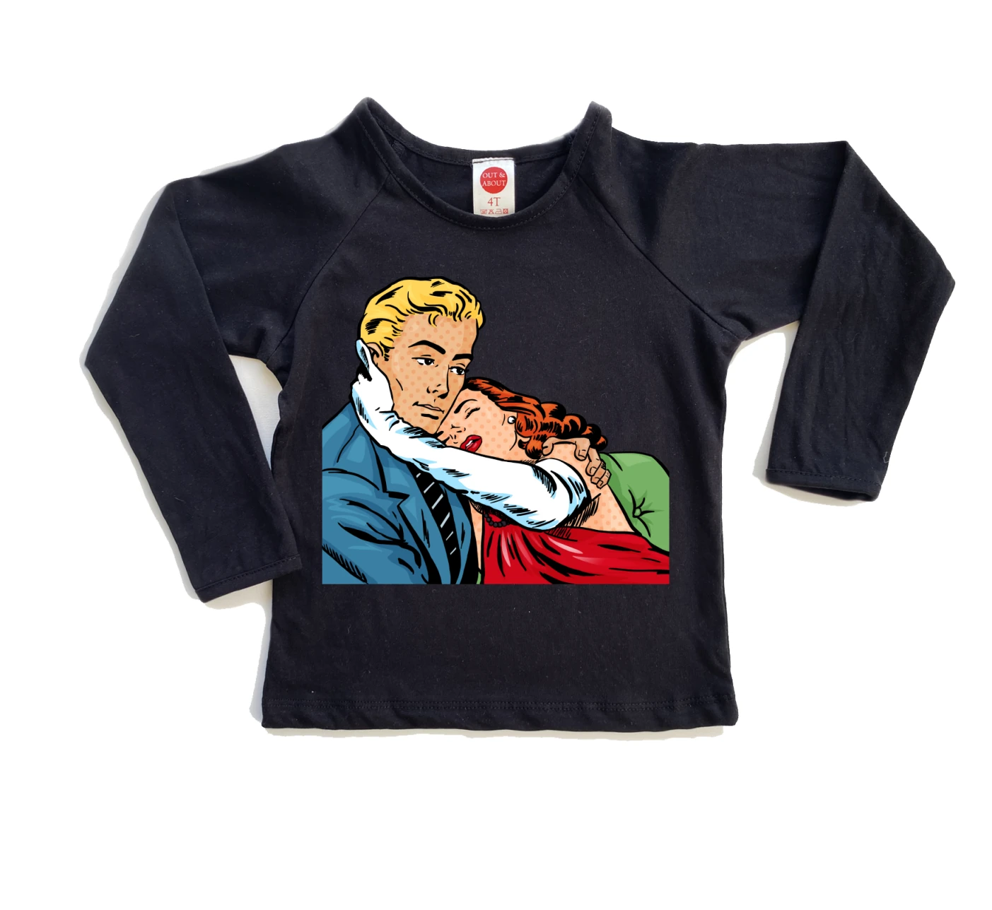 חולצת ילדים 100% כותנה, מיוצר ונתפר בישראל. גזרת רגלן למראה משודרג ציור בסגנון פופ ארט / קומיקס של אלית אבני שרון: זוג מהסרטים