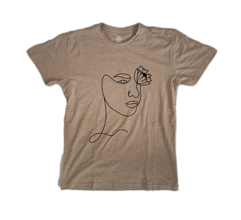 אישה ופרח מצויירים בקו אחד חולצת פרמיום בהרכב בד של כותנה וויסקוזה בלנד טבעי ונעים עם קצוות פרומים וגזרה משוחררת.
