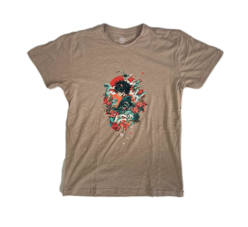 תיאור על ידי בינה מלאכותית: נער בסגנון אנימה מתוך מסגרת מלאה בפרחים, המהווה עיצוב צעיר, צבעוני ומרהיב המתאים במיוחד להדפסה על בגדים, בעיקר חולצות. סגנון חופשי ואופנתי המשדר אופנה צעירה וצעירה, מתאים לשימוש יומיומי ולאירועים קטנים.