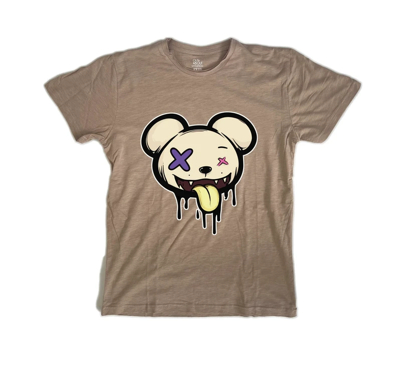 דמות דובי סגולה עם תפרים, עין מקורזת באיקס, אף אדום ובידו סכין. חולצת פרמיום בהרכב בד של כותנה וויסקוזה בלנד טבעי ונעים עם קצוות פרומים וגזרה משוחררת.