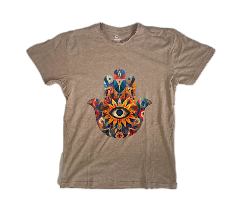חמסה חולצת פרמיום בהרכב בד של כותנה וויסקוזה בלנד טבעי ונעים עם קצוות פרומים וגזרה משוחררת.