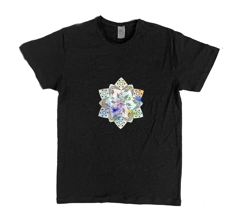 תיאור על ידי בינה מלאכותית: הדפס מנדלה מרהיב עם עיצוב של פרחים דמויי כוכבים בגוונים רכים ומרהיבים. העיצוב מאפשר להתאים בצורה מושלמת לחולצות ובגדים אחרים עם סגנון אופנה צעיר וקלאסי יחד.