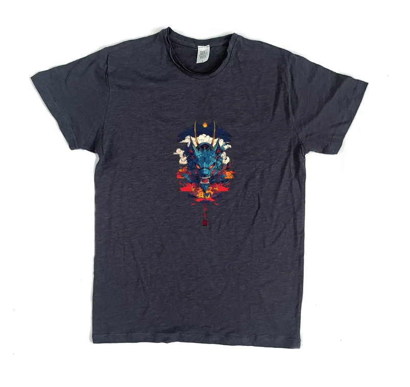 תיאור על ידי בינה מלאכותית: דרקון שמיימי נחש אש הולך בין יסודות הטבע עטור בלהבות ומתפתל בין עננים ופרחים בצבעים עזים. עיצוב אינטרסטינג ומורכב המתאים בצורה מושלמת להדפסה על בגדים, בעיקר חולצות, ויכול להעניק מראה מודרני וייחודי לכל הופעה.