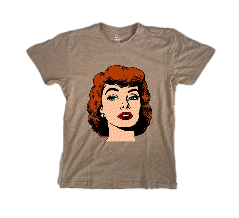 ציור בסגנון פופ ארט / קומיקס של אלית אבני שרון: אישה סופר על חולצת פרמיום בהרכב בד של כותנה וויסקוזה בלנד טבעי ונעים עם קצוות פרומים וגזרה משוחררת.