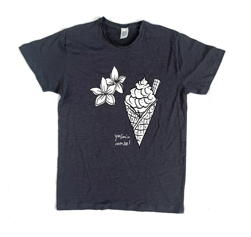 הדפס של המאיירת יסמין מזל : קוקטיל בקוקוס טרופי חולצת פרמיום בהרכב בד של כותנה וויסקוזה בלנד טבעי ונעים עם קצוות פרומים וגזרה משוחררת.
