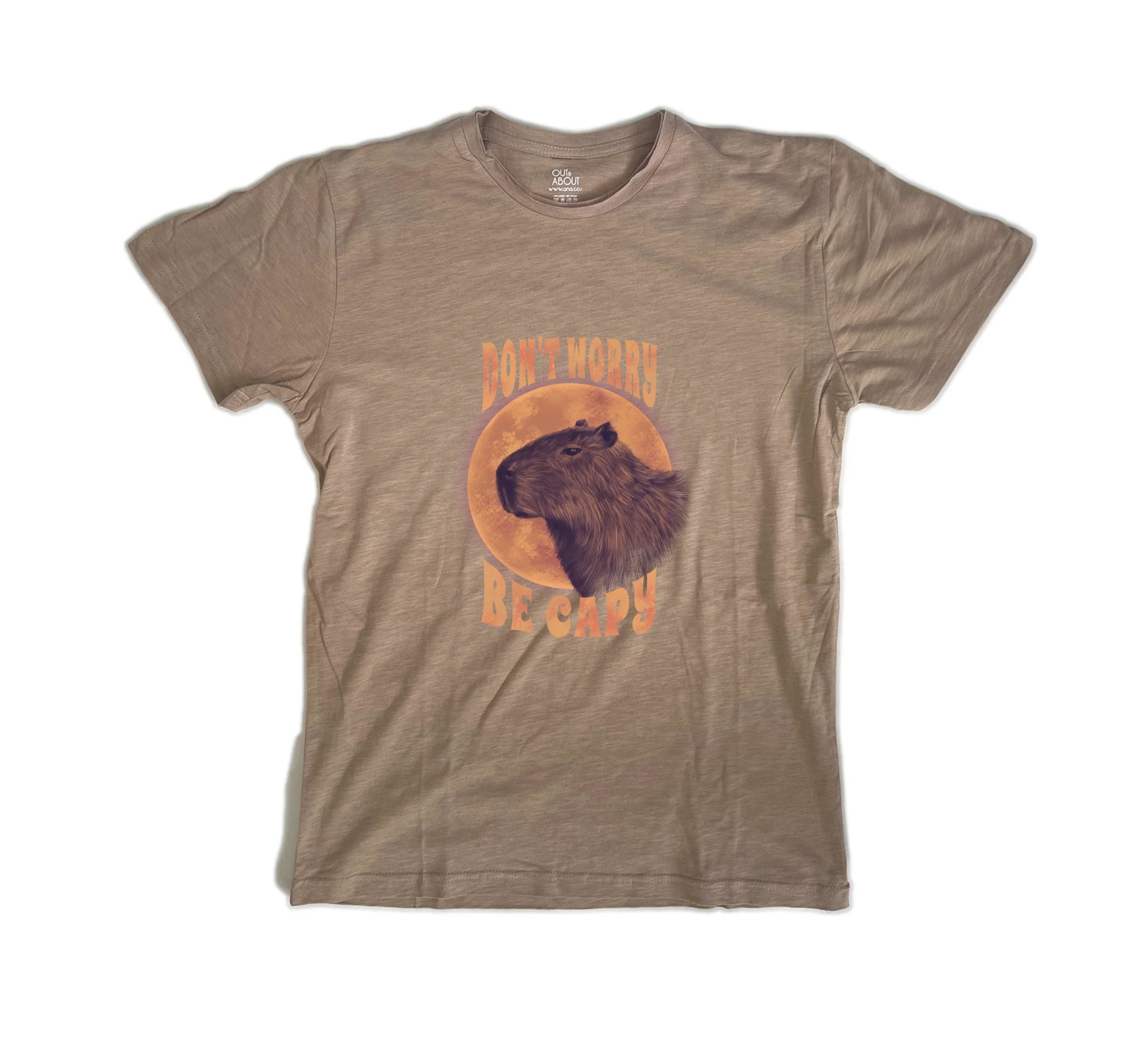 קפיברה חמוד עם הכיתוב dont worry be cappy חולצת פרמיום בהרכב בד של כותנה וויסקוזה בלנד טבעי ונעים עם קצוות פרומים וגזרה משוחררת.