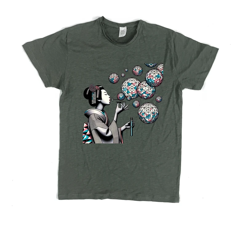 תיאור על ידי בינה מלאכותית: ציור משתקף של גיאישה בסגנון מודרני וכך מתאים במיוחד להדפסה על חולצות ובגדים אחרים. העיצוב מורכב מציור צילום של גיאישה יפנית בעת 'הרגע הכי טוב 5', עם פרטים רגישים ופריטים אומנותיים שונים. צבעי אפור, שחור ולבן מושלמים לתיק ונינוח בעיקר בצללית. קווים נקיים ומינימליסטיים משלבים נופי אומנות יפנית עם עדכניות מודרנית.