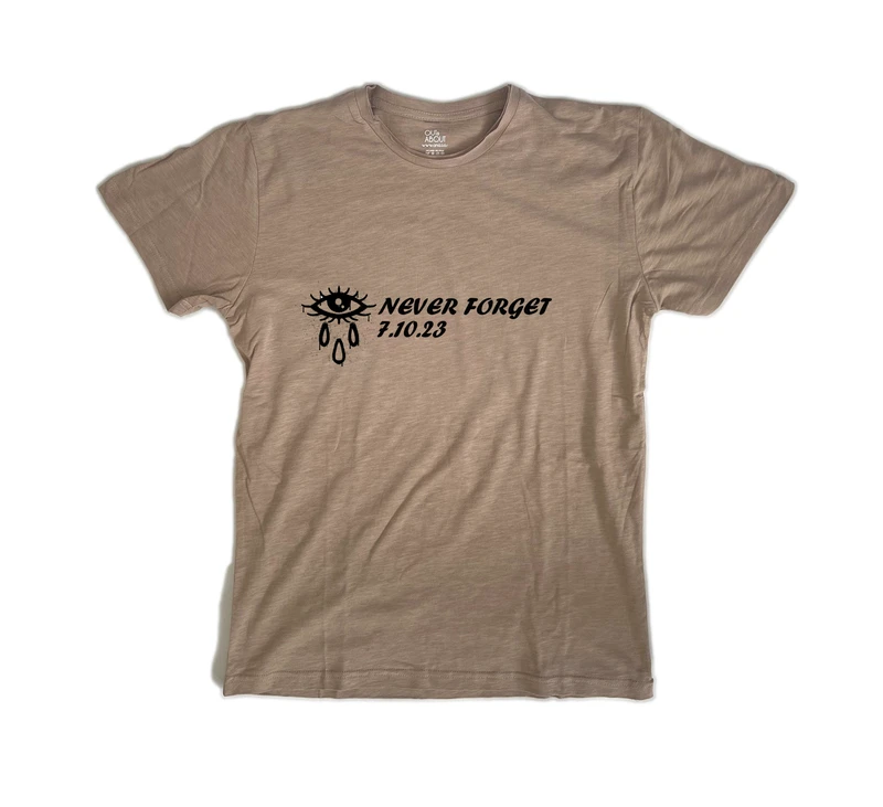 never forget 7/10/23 חולצת פרמיום בהרכב בד של כותנה וויסקוזה בלנד טבעי ונעים עם קצוות פרומים וגזרה משוחררת.
