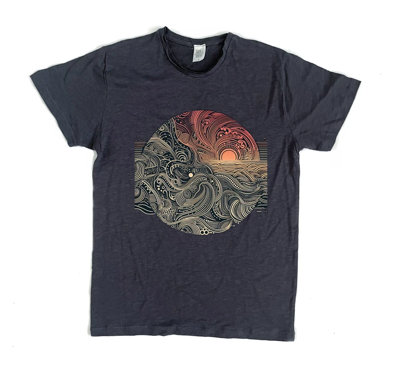 תיאור על ידי בינה מלאכותית: ההדפס 'sunset 2' מציג תצפית מרהיבה של זמן השקיעה בצבעים חמים ורכים. העיצוב מורכב משפע של גוונים טבעיים של כתום, צהוב ואדום המשתלבים באופן הדוק ומעניקים מראה מרהיב ברמת הפרטים. עיצוב זה מושלם לשימוש על בגדי כל הזמנים, במיוחד על חולצות מעוצבות.