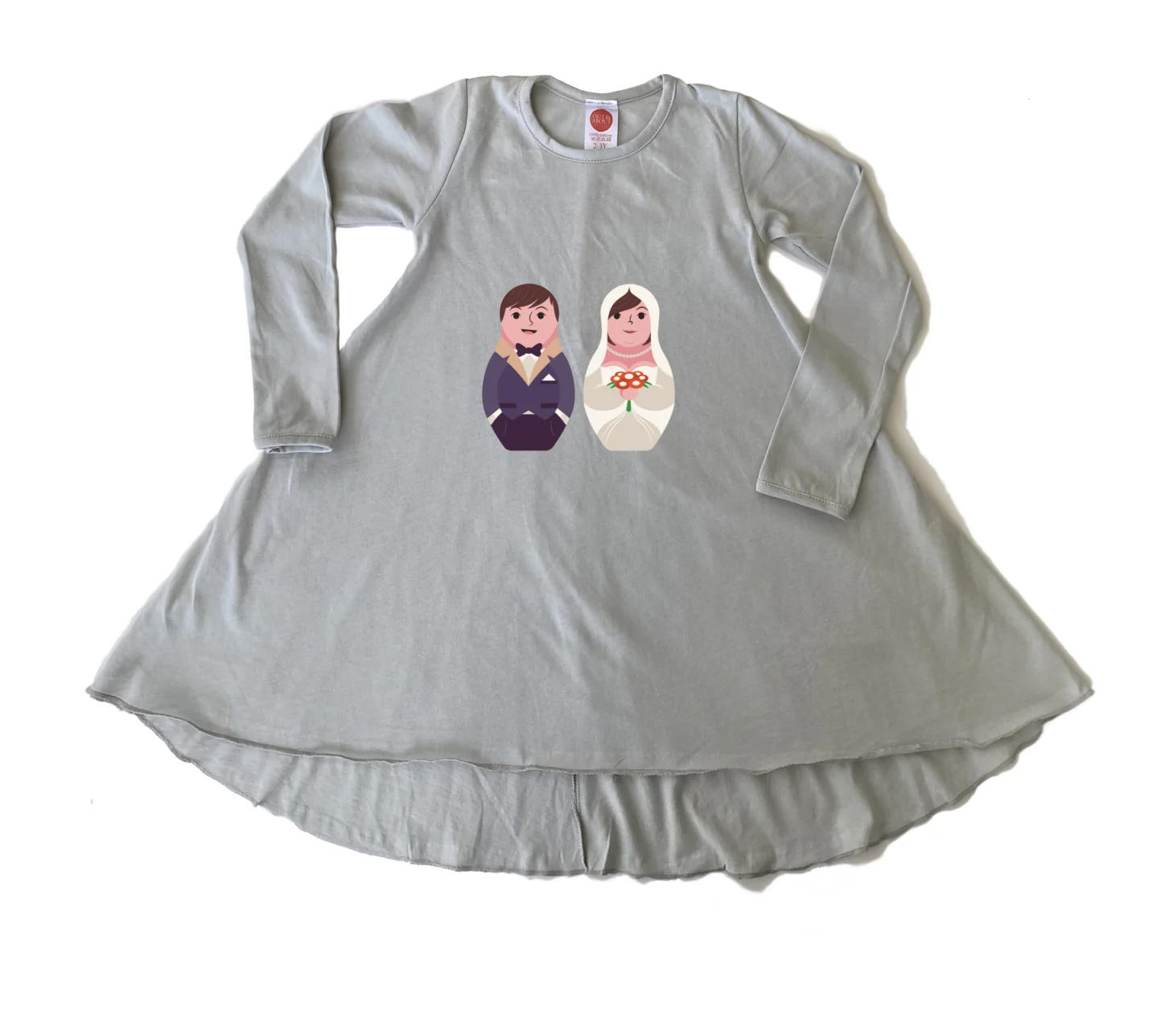 בובת מטריושקה חמודה עם מטפחת נקודות אוחזת במצלמת רטרו ירוקה שמלה לילדה 100% כותנה מיוצר ונתפר בישראל